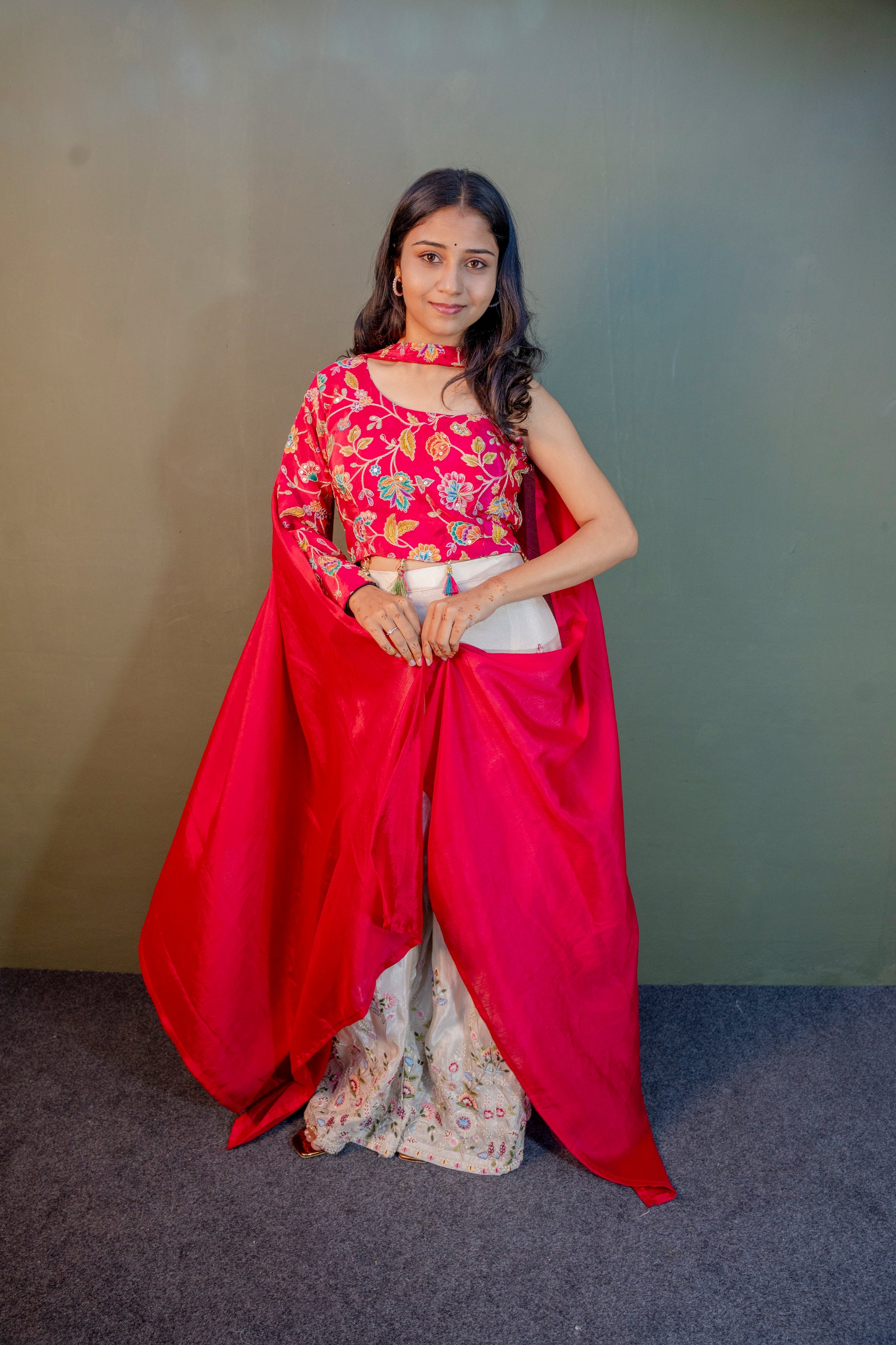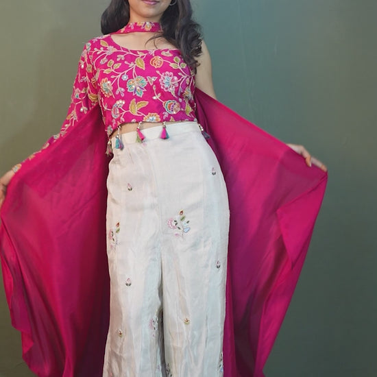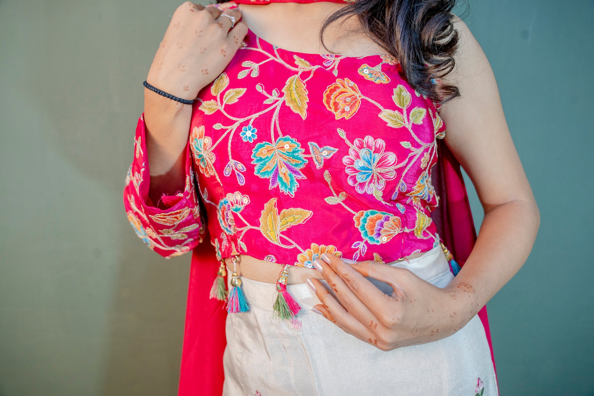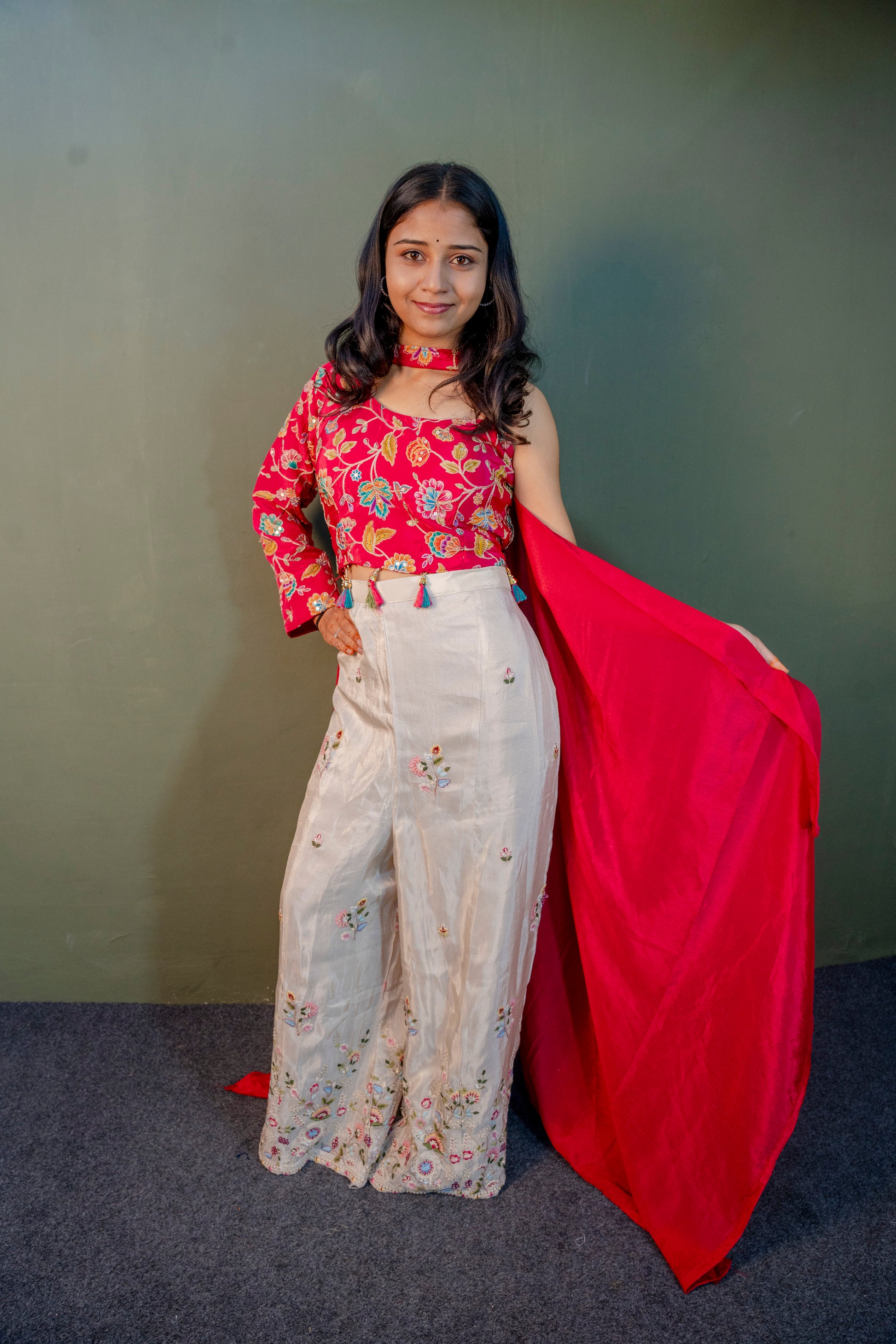 Embrace soft elegance with this Blush Harmony Pink & Off-White Indo-Western 3-Piece Set, beautifully detailed with piping hand work and delicate stone embellishments. Designed for festive occasions and special gatherings, this ensemble blends graceful colour tones with refined craftsmanship.