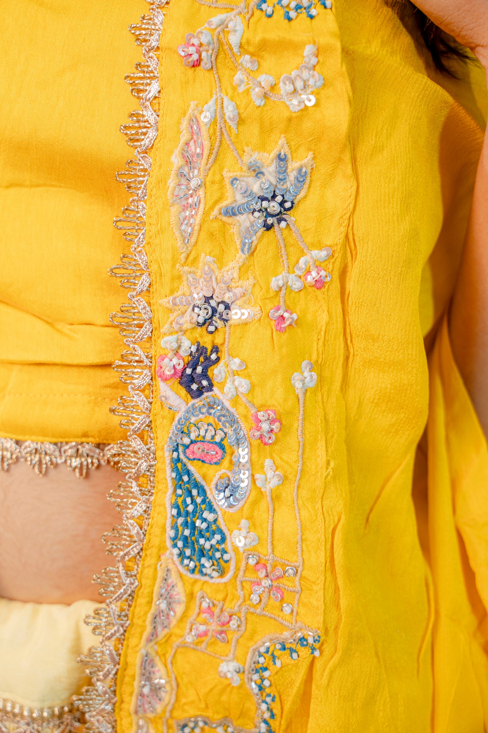 Radiate festive charm with this Golden Aura Yellow Indo-Western 3-Piece Set, crafted with piping hand work and delicate stone embellishments. Designed for special occasions and celebrations, this ensemble combines vibrant colour with refined craftsmanship for a graceful, contemporary look.