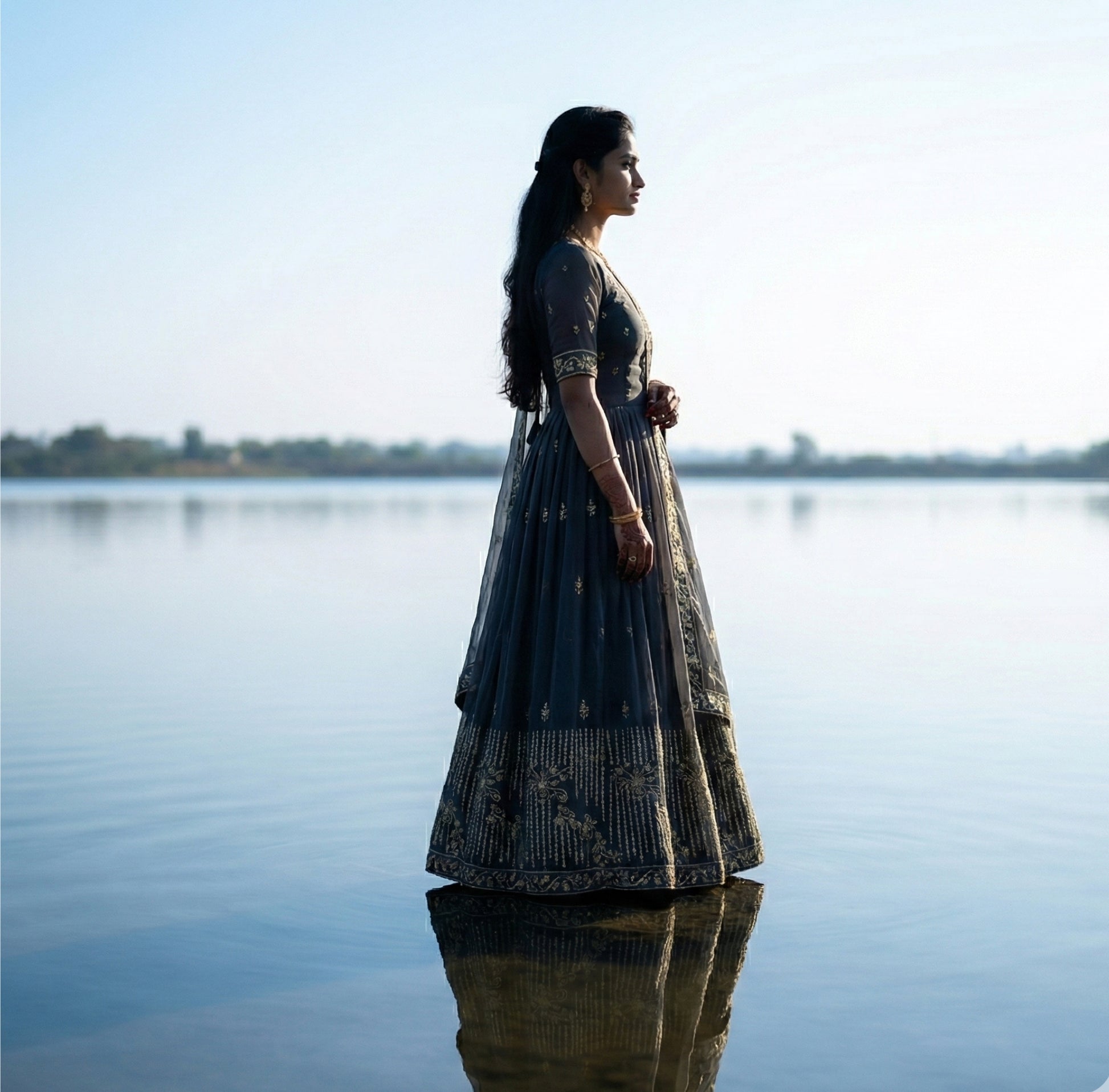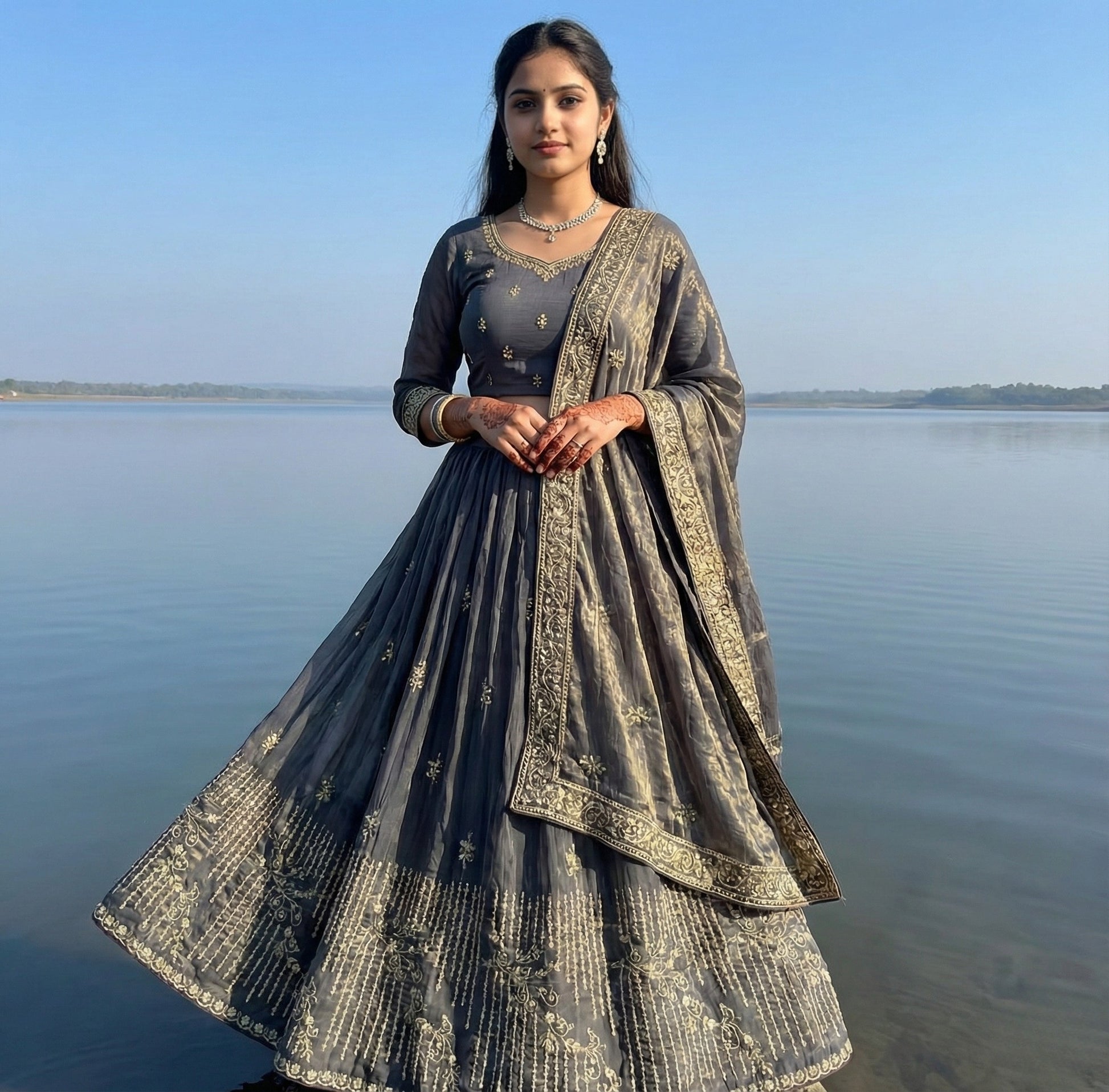 Sophisticated and elegant, this grey georgette suit features intricate stone work combined with detailed hand embroidery, creating a refined shimmer without looking overdone. The lightweight georgette fabric ensures a graceful drape, making it ideal for weddings, festive occasions, and evening functions.