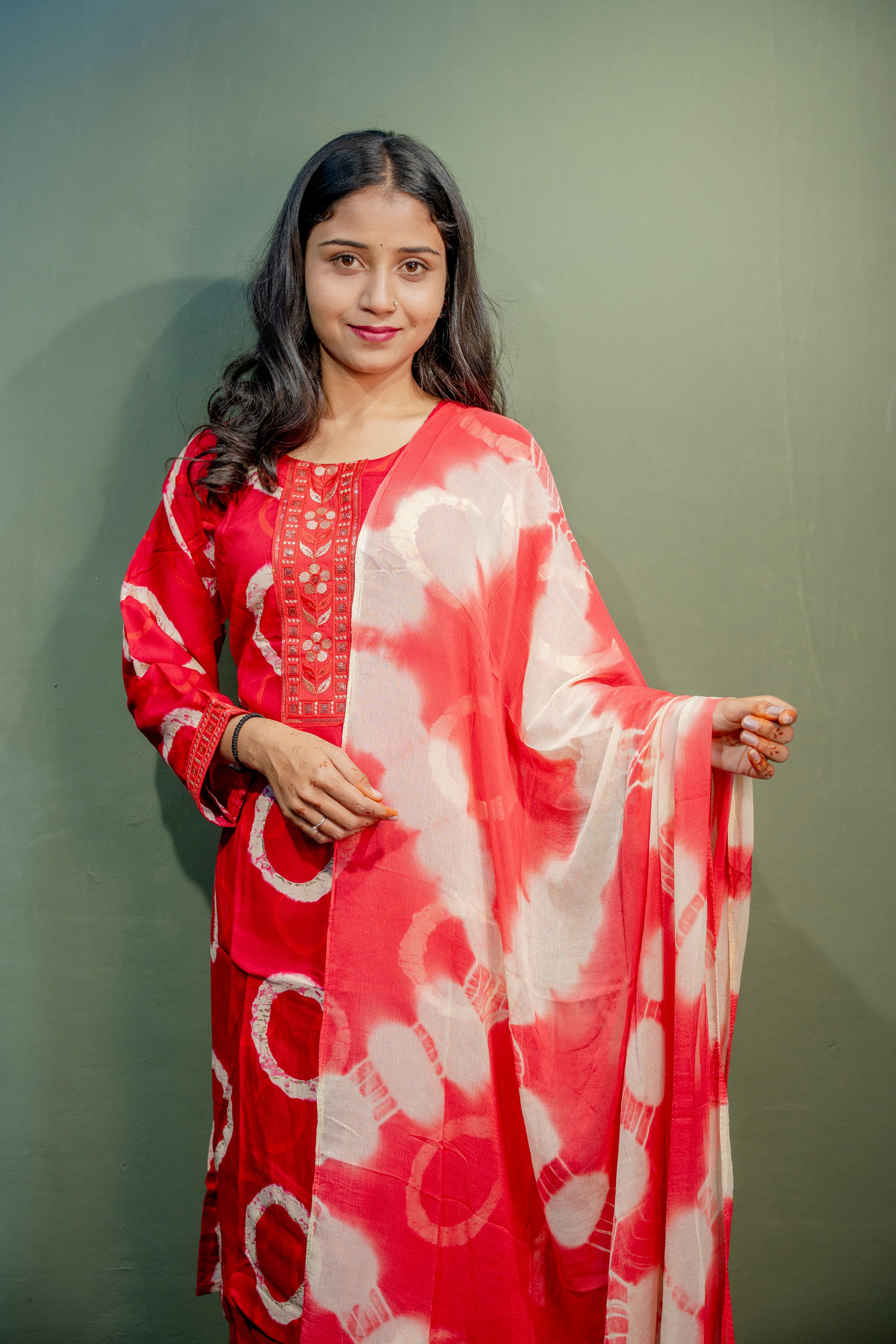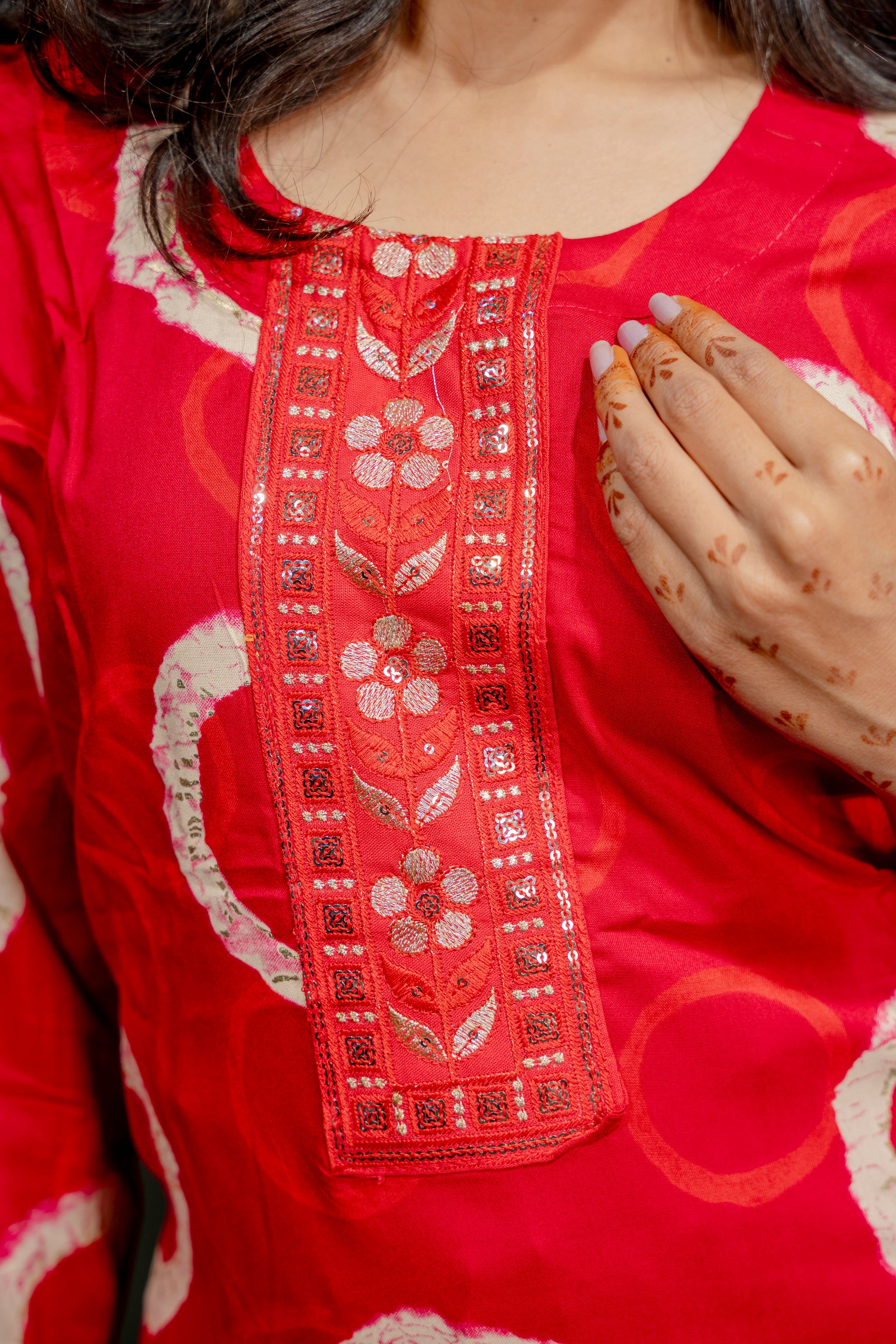 The dress showcases stylish digital prints, complemented by clean piping work that sharpens the overall silhouette. The rich red tone adds vibrancy and energy, making this dress a strong choice for festive gatherings and evening outings.