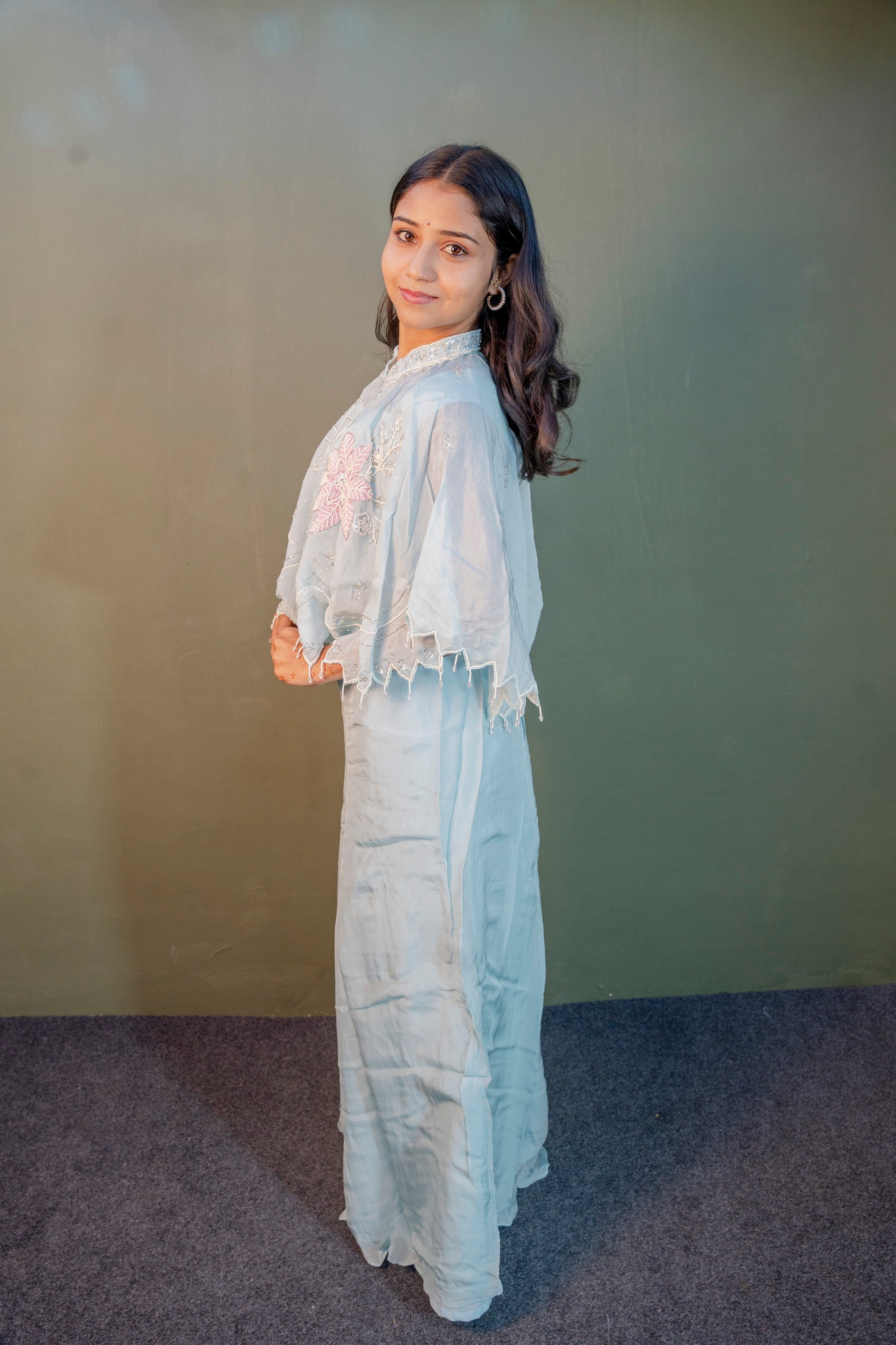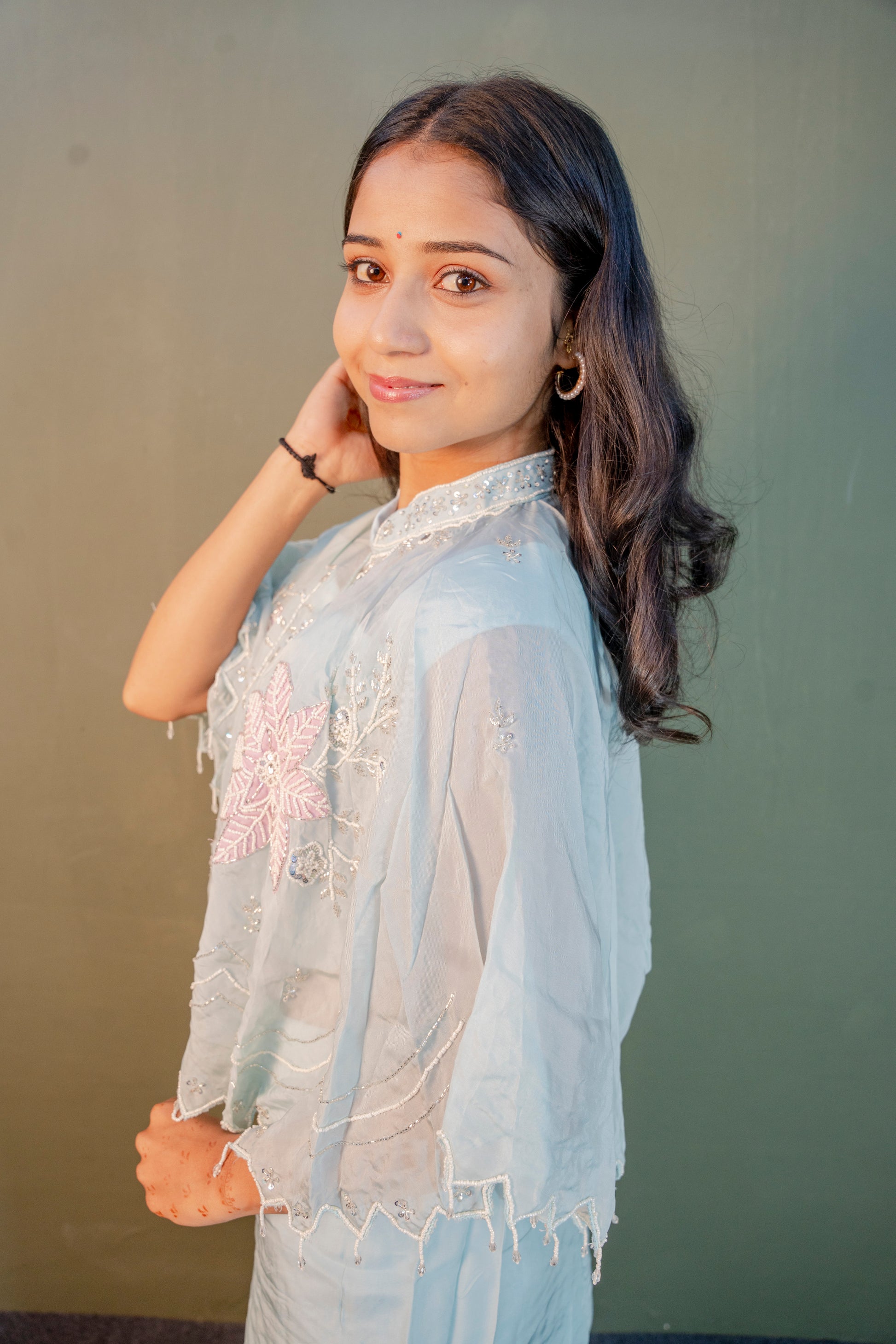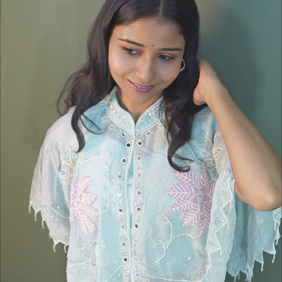Embrace refined elegance with this Serene Sky Blue Indo-Western 3-Piece Set, beautifully crafted with piping hand work enhanced by delicate stone detailing. Ideal for festive occasions and special celebrations, this ensemble reflects a perfect balance of grace and craftsmanship.
