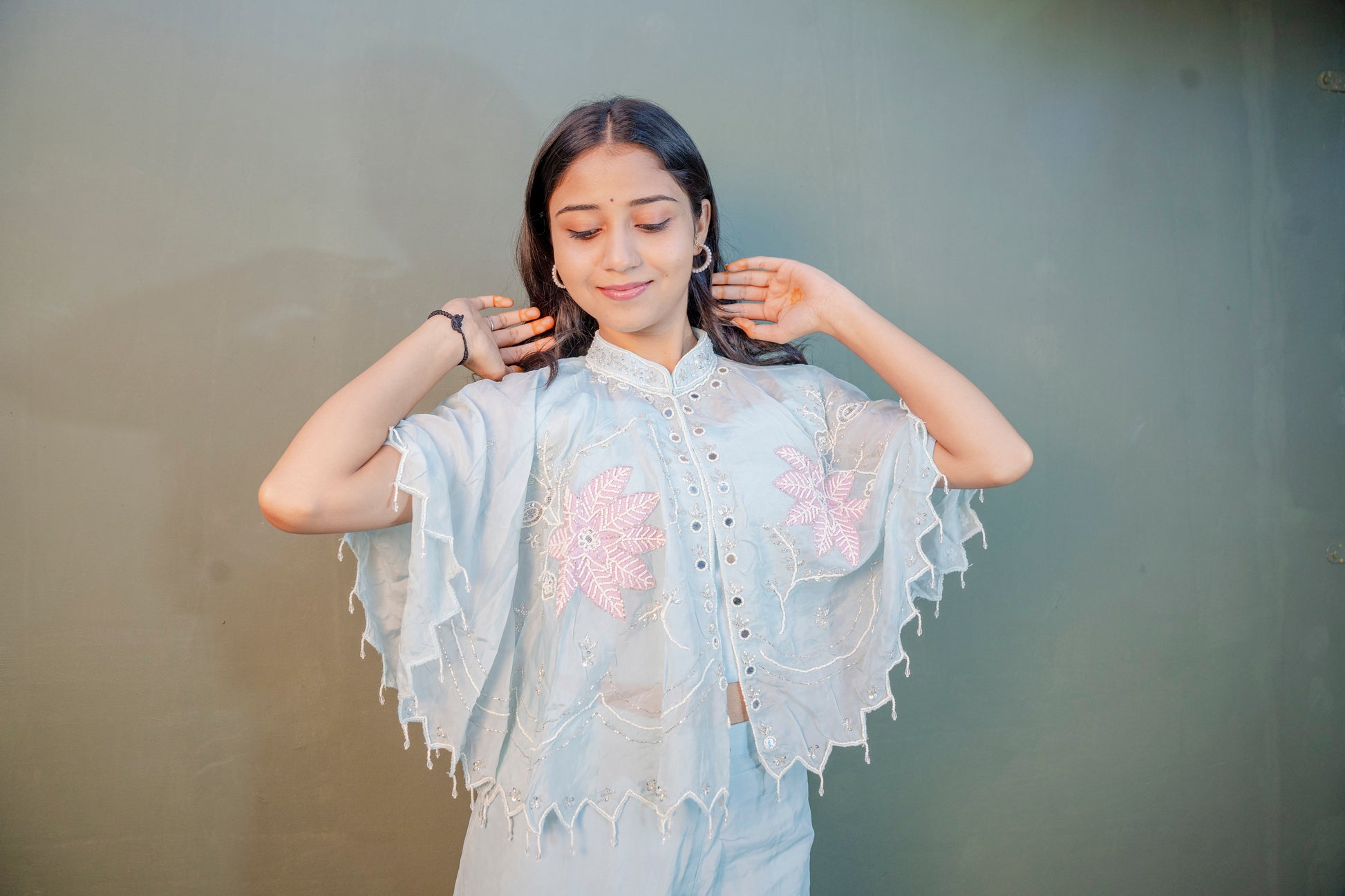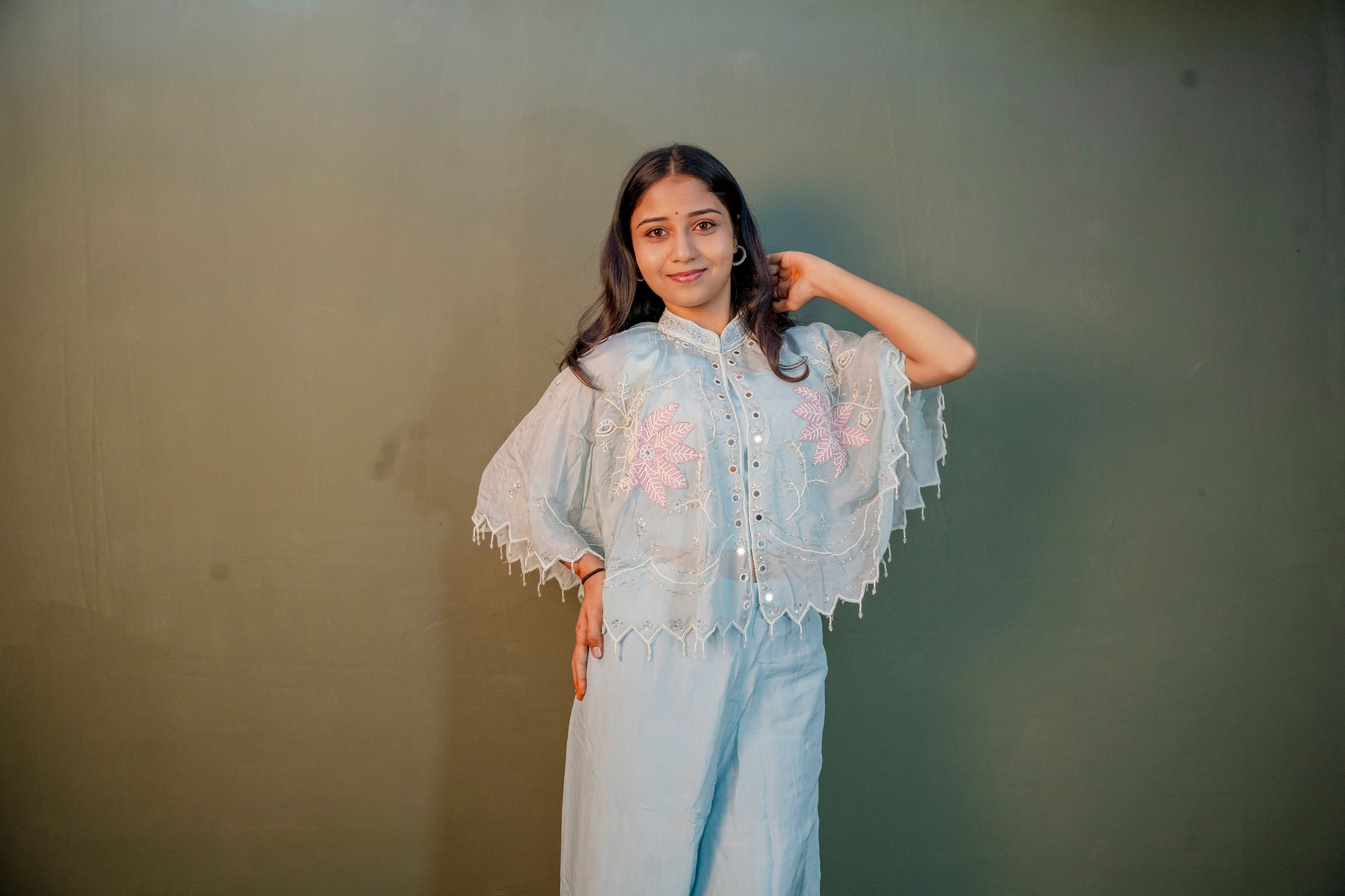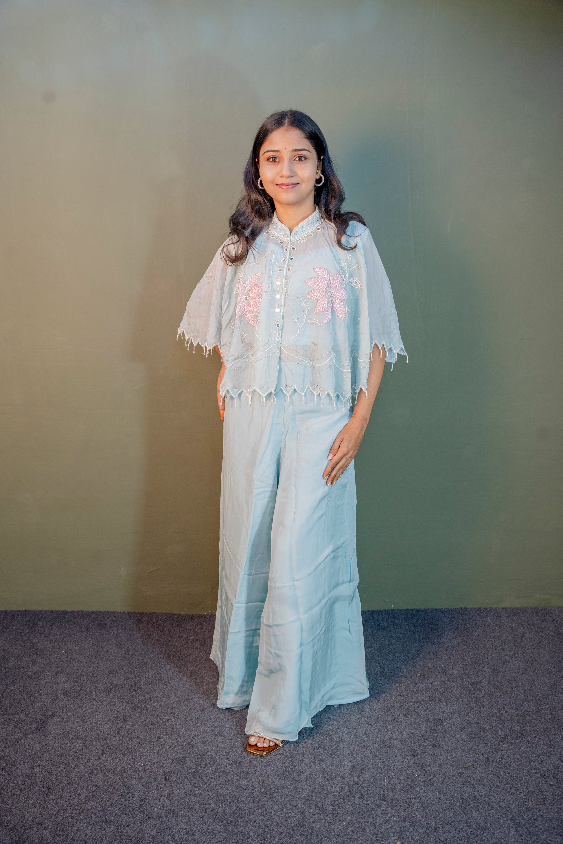 Embrace refined elegance with this Serene Sky Blue Indo-Western 3-Piece Set, beautifully crafted with piping hand work enhanced by delicate stone detailing. Ideal for festive occasions and special celebrations, this ensemble reflects a perfect balance of grace and craftsmanship.