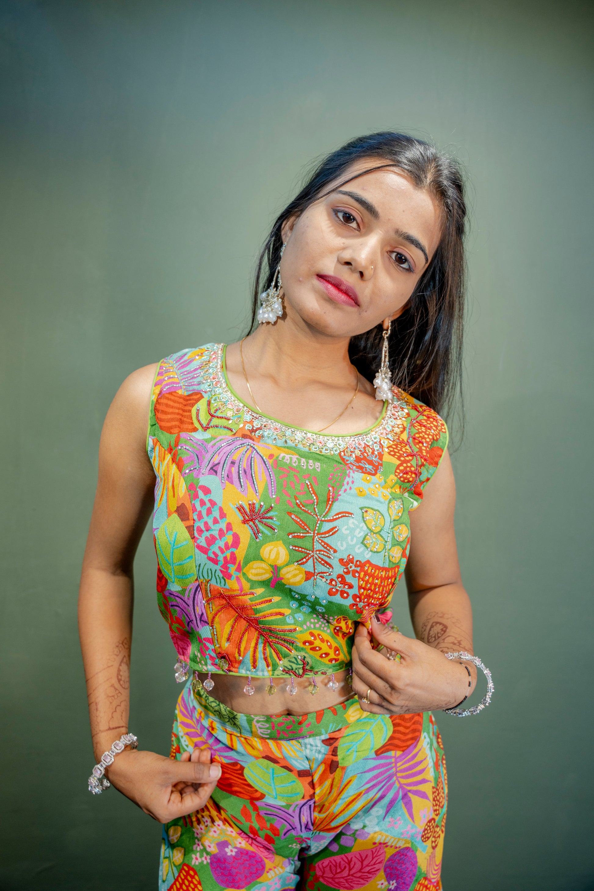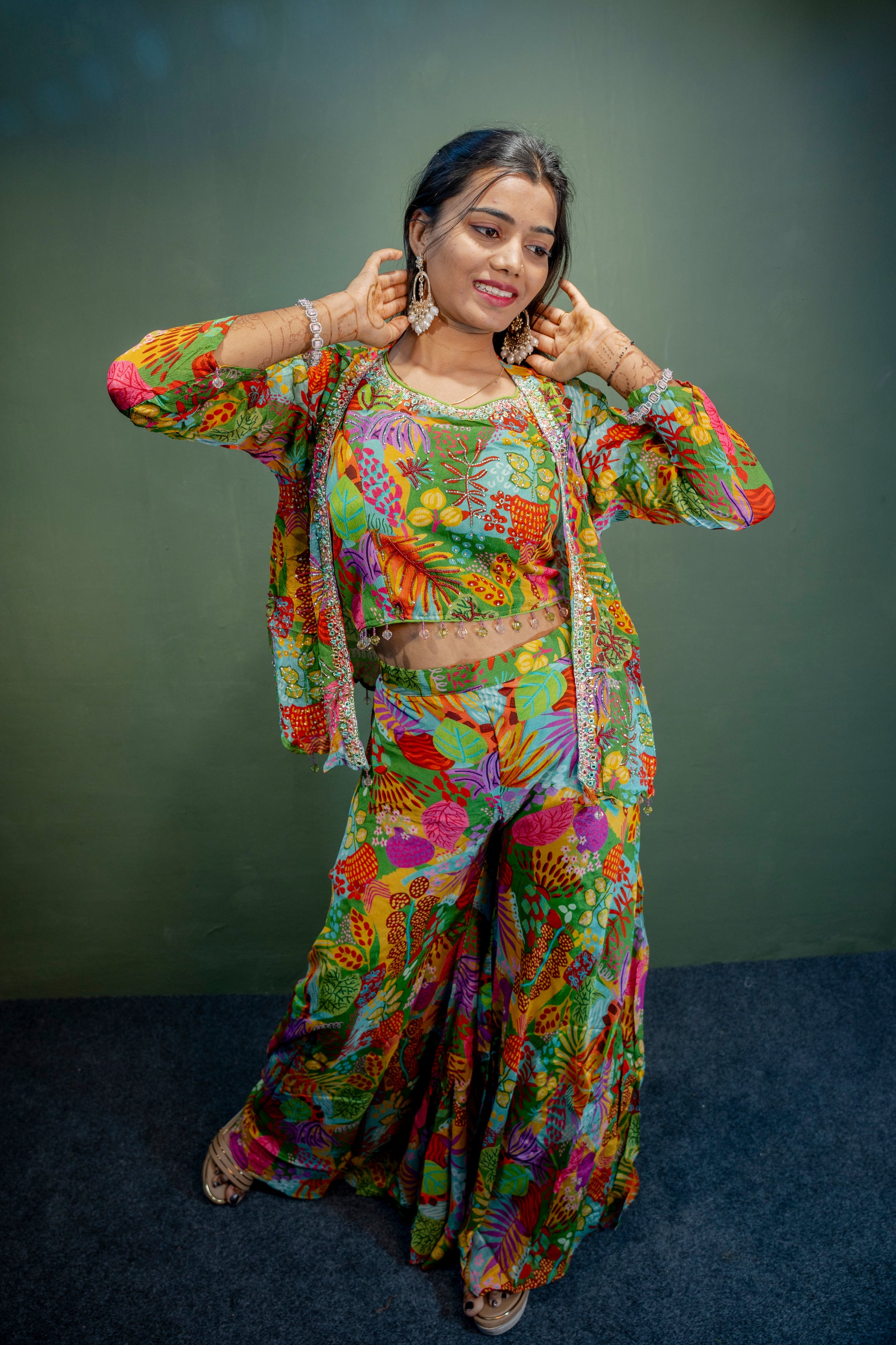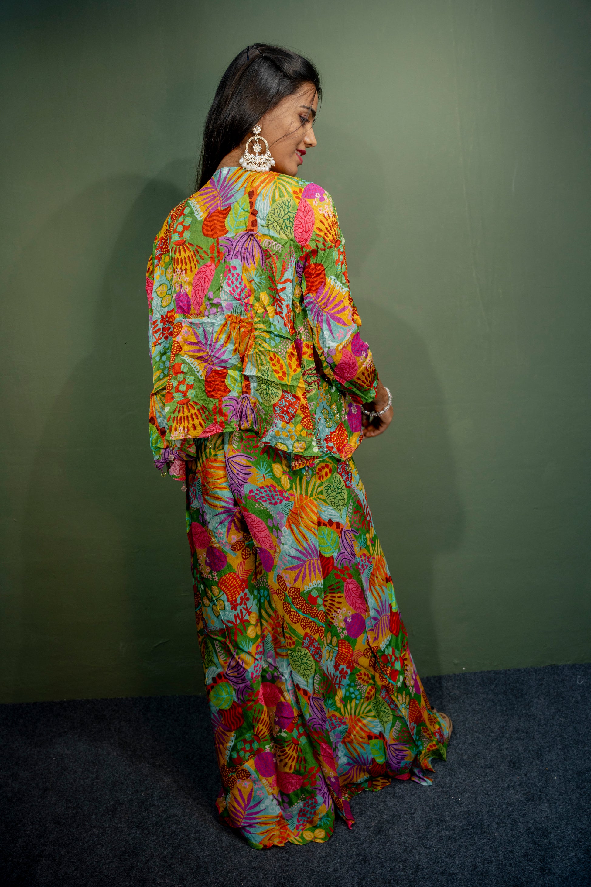 Turn heads with this Sophisticated Multi-Colour Indo-Western 3-Piece Set, featuring piping hand work accented with delicate stone detailing. Ideal for festive occasions and special gatherings, this ensemble combines traditional craftsmanship with contemporary elegance.